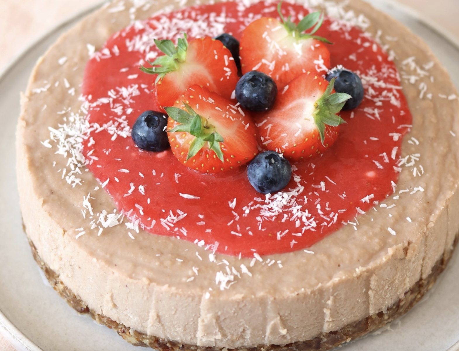 Vegan en glutenvrij! De combinatie van geweekte cashewnoten, kokosolie en banaan zorgt voor een heerlijk romige vulling. Gezoet met dadels en banaan. Van deze cake kun je zonder schuldgevoel genieten.